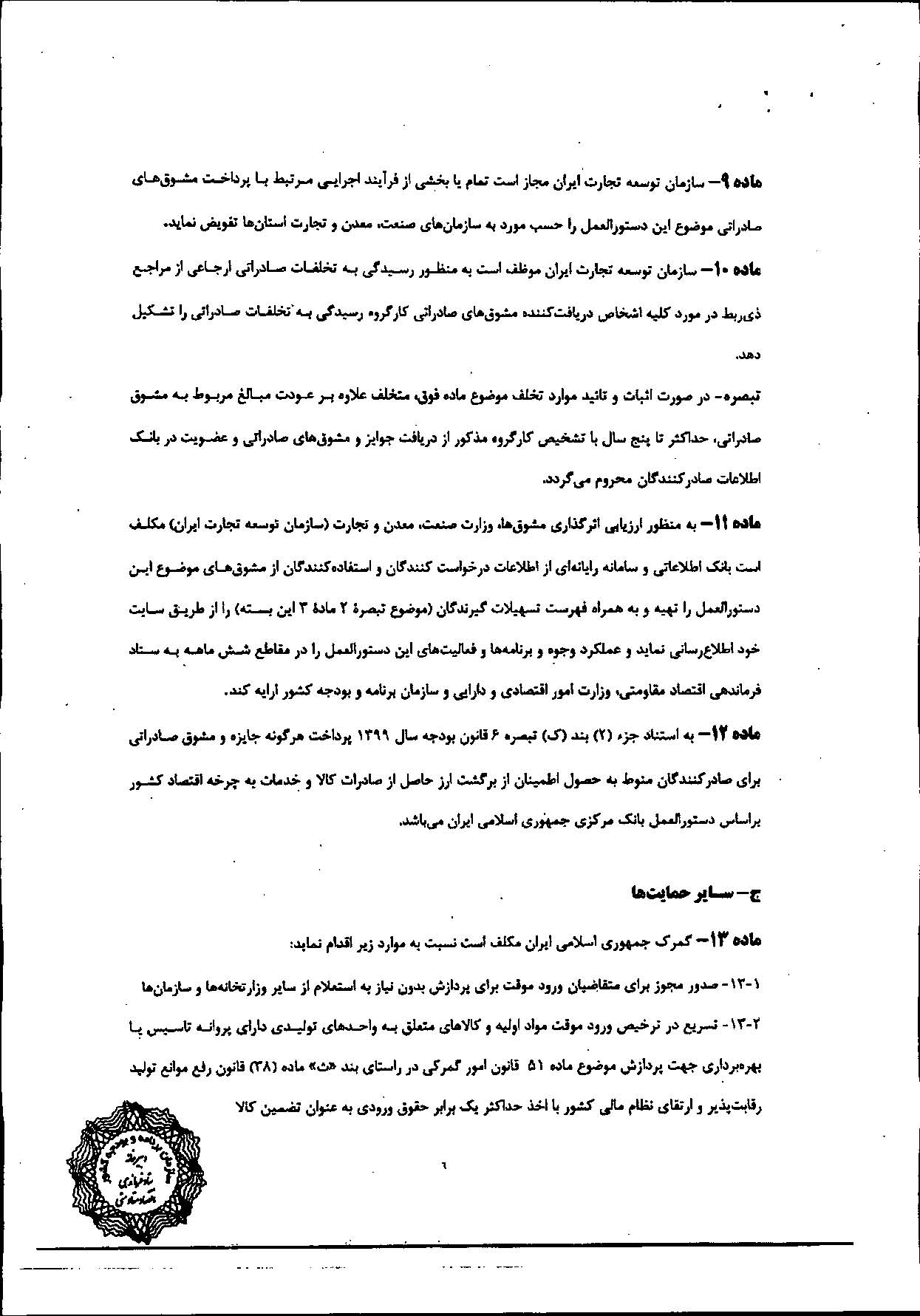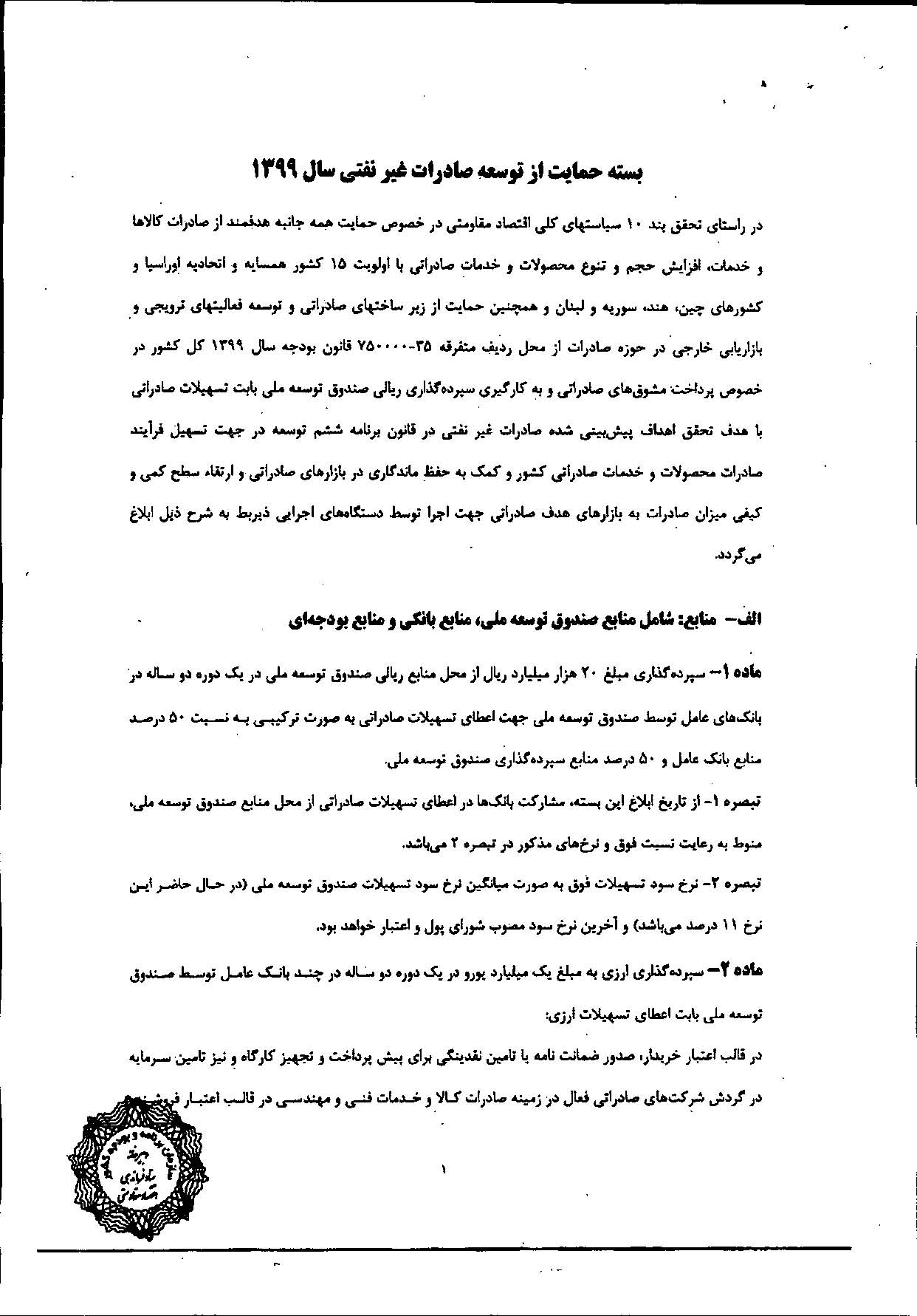 پرداخت مشوق‌های صادراتی مندرج در بند ۵ بسته حمایت از صادرات غیر نفتی سال ۱۳۹۹ که توسط معاون اول محترم رئیس جمهور و رئیس ستاد فرماندهی اقتصاد مقاومتی ابلاغ گردیده است